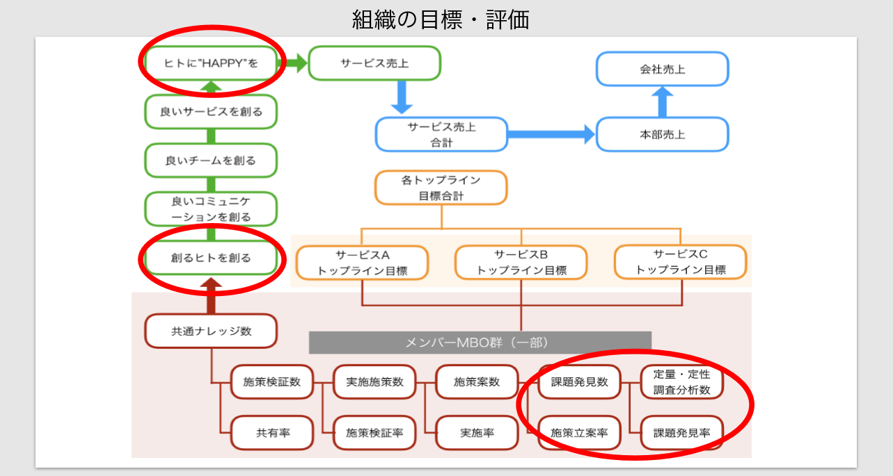medibaのミッションとして「ヒトに“HAPPY”を」を掲げていて、その成果がサービス売り上げになると考えています。創るヒトを創った結果、良いコミュニケーションが生まれ、良いチームが生まれ、良いサービスが創られた結果、ヒトをHAPPYにできるのだ、だから僕たちは創るヒトを創ろうというところをKGI(Key Goal Indicatorの略で「経営目標達成指標」)に近くしました。