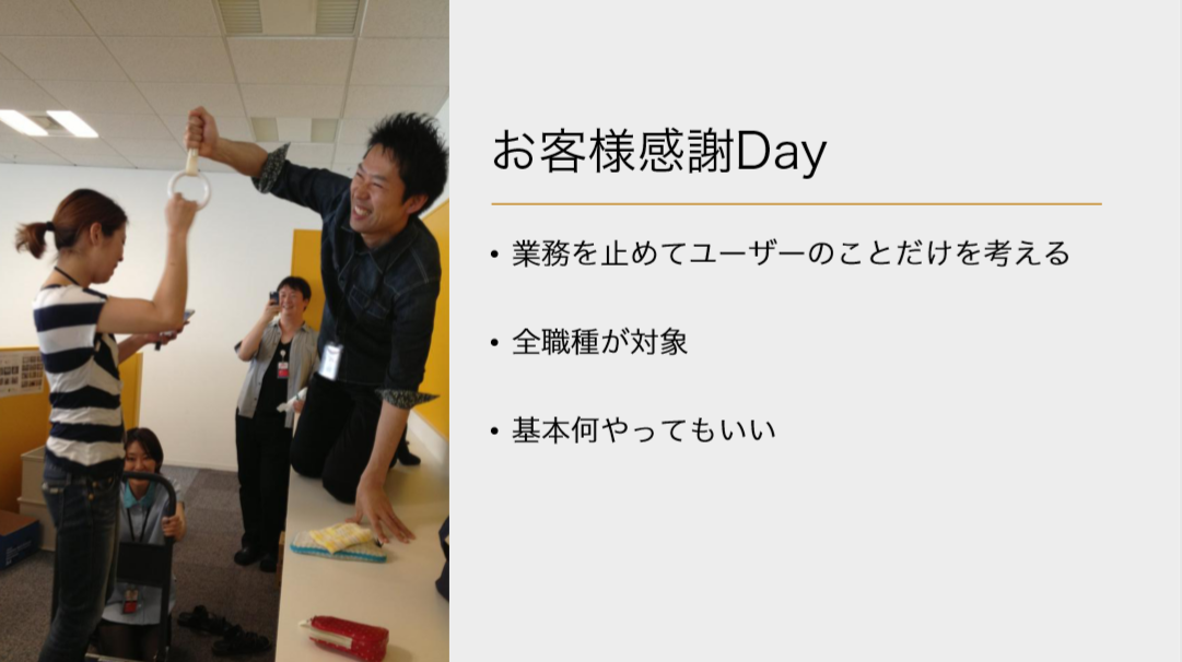 日々の業務の中でユーザのことを考えることはありますが、チームや組織が大きくなる中で個々がバラバラに考えていても弱いですよね。そこで、お祭りっぽくやってしまえ!ということでその日一日は全ての業務をやめてもらい、全職種がユーザのことだけを延々と考えるお客様感謝Dayをやってみました。