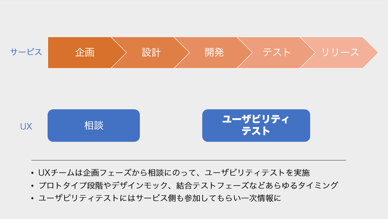 図のように、UXチームは企画段階で相談にのりながら、開発リリーステストの段階でユーザビリティテストを実施し、ユーザビリティテストでのバグ、エラーを直してからリリースしよう、というフローを作りました。