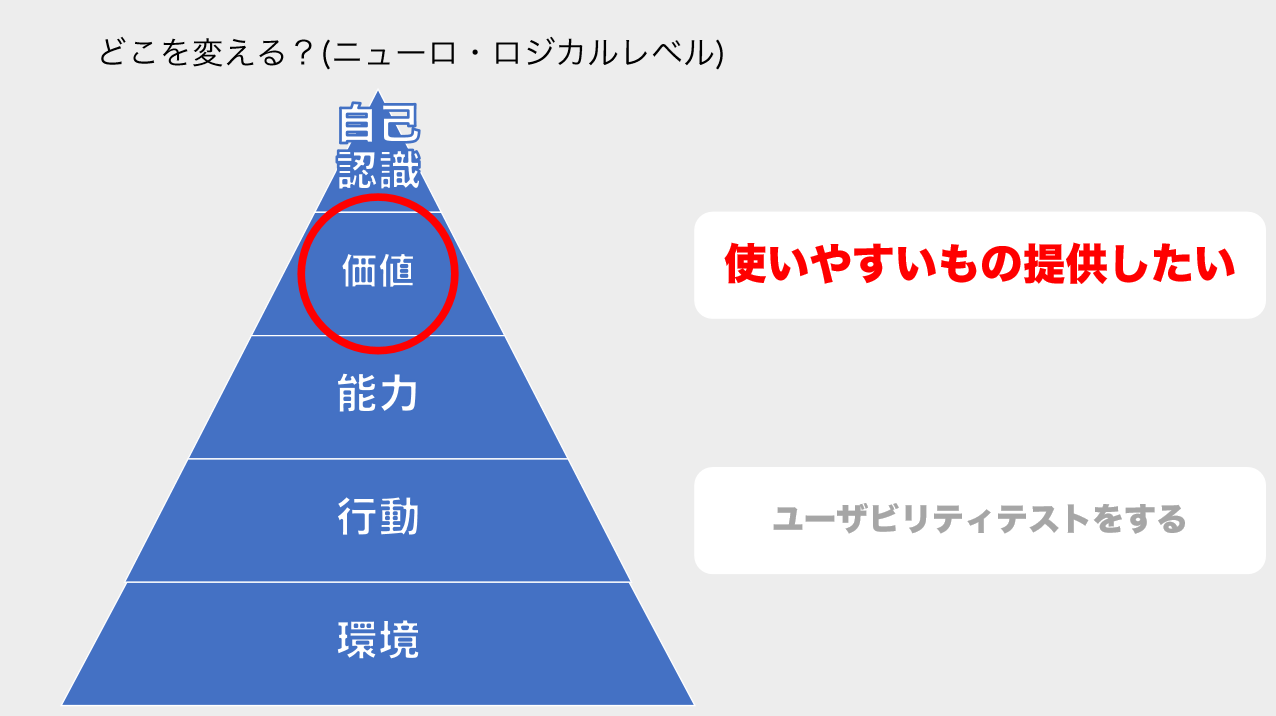 例えば私はユーザビリティテストという行動を半年に1回、年に1回など行いましたが、そのような頻度が少ない非日常的な行動を変えたところで価値観のところまで到達することは難しいです。