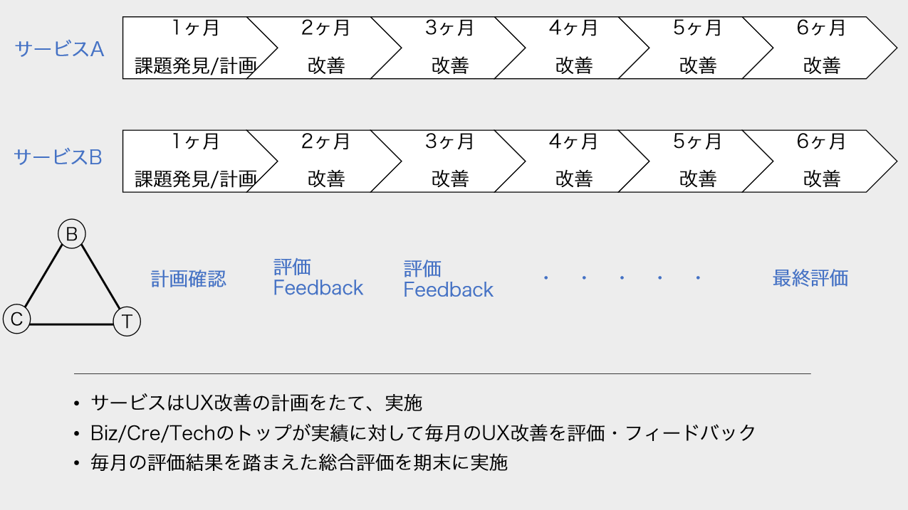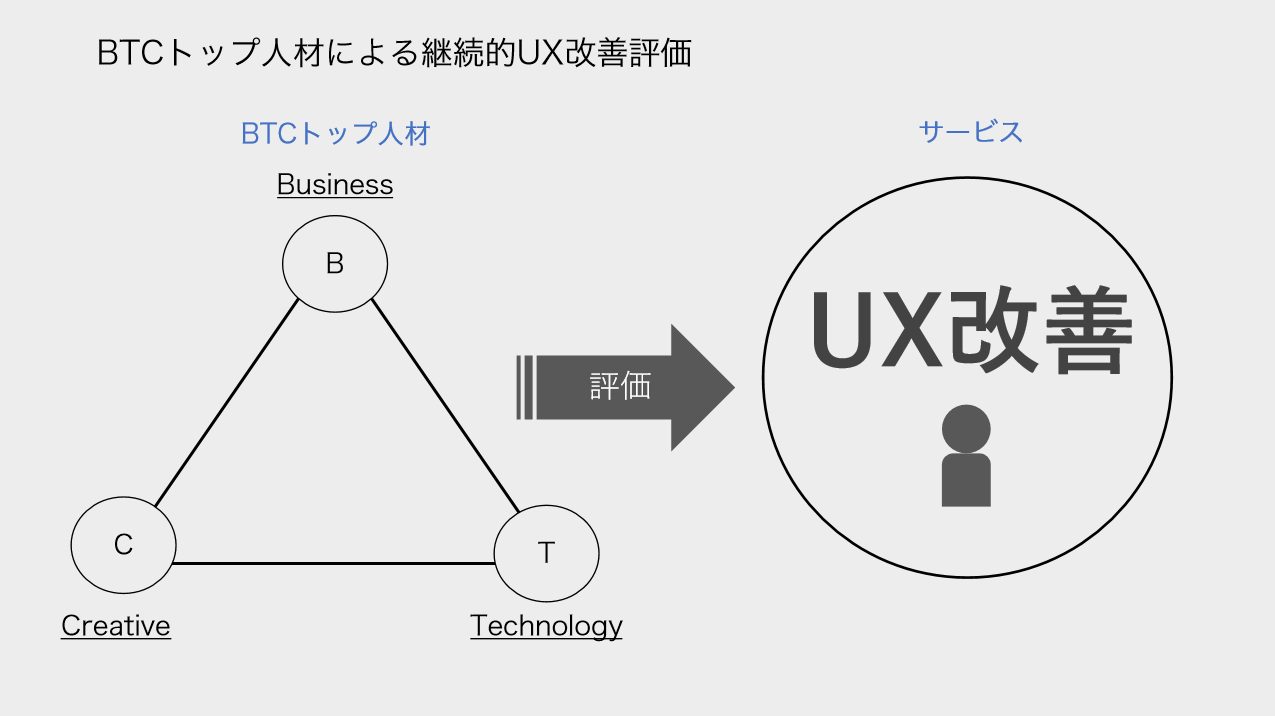 そこで、BTC(Business Creative Technology)各トップを集めて各サービスのUX改善をそれぞれの視点で評価していこうとしました。