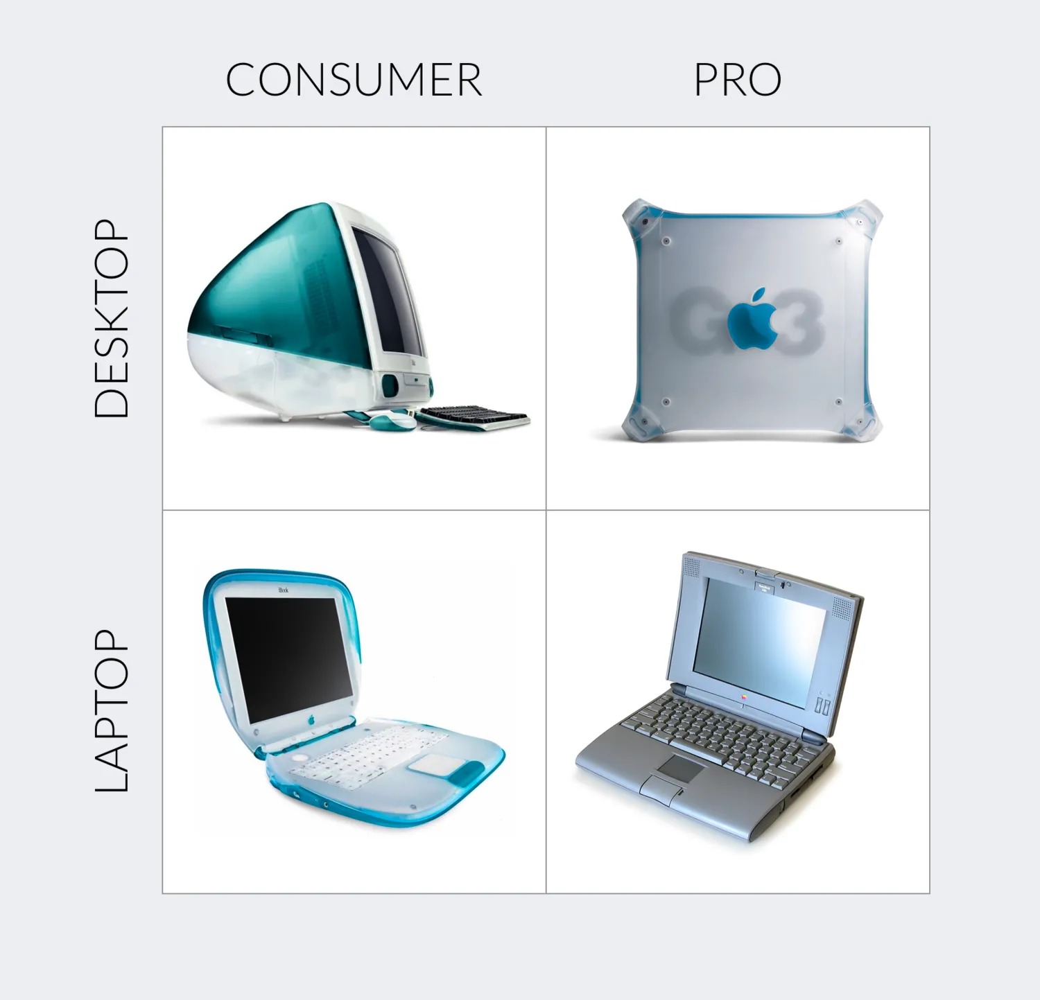 Jobs氏はプロダクトのラインナップを4つに絞ることで、この問題に対処しました。2種の消費者(一般消費者とプロフェッショナル)に向けた、ノートパソコンとデスクトップです。これにより、購入する際「考えるまでもなく」商品を選べるようになったのです。