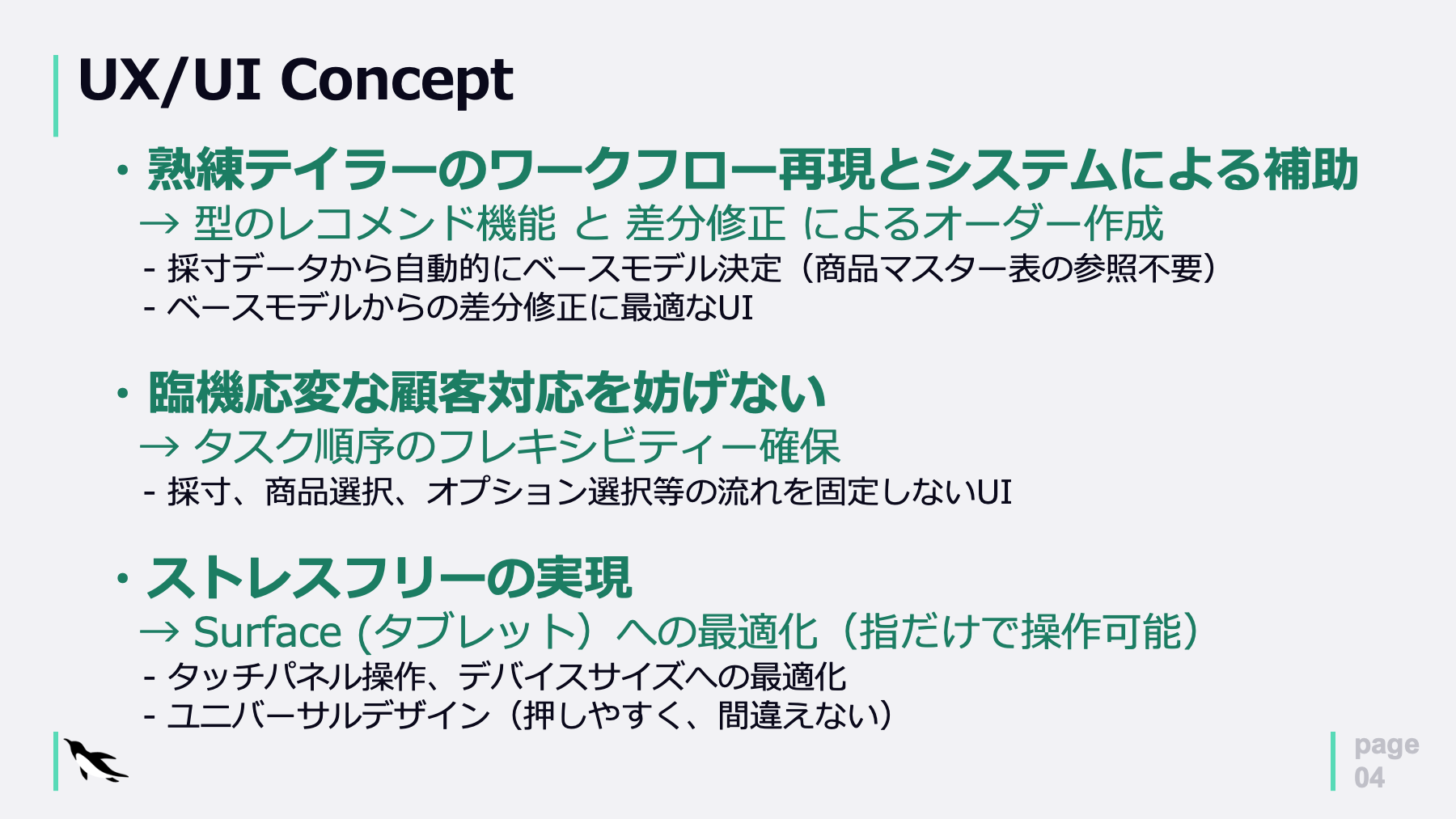 土屋:そうですね。皆さんそれぞれのスタイルがあるのですが、実は採寸のところにはあまり違いはなく、それ以外の部分で各々のノウハウが隠れているようでした。そういったスタイルガイドさんの個性を殺さないように、システムとしては自由度を持たせようというコンセプトがやりながら決まりました。もしアルバイトのような人がやる作業であれば、ウィザードのように全部システムに落とし込みますが、今回の場合は職人の方が使うようなツールとして、それは多分良くないんだろうなと思いました。