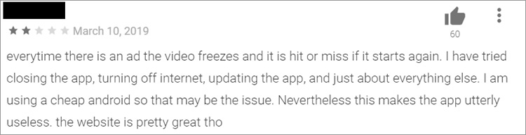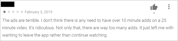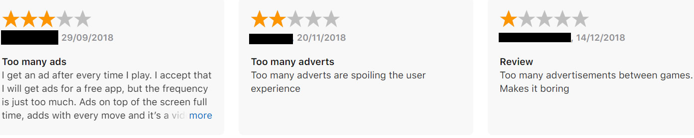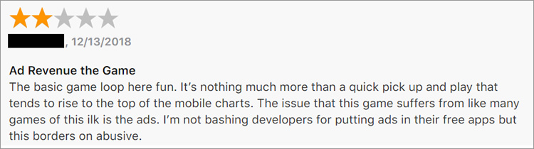 ユーザー離れについてのSOOMLAのレポートによれば、ある広告を1000回表示するたびに8人のユーザー離れがおこったといいます。たとえば次のレビューでは、ゲーム自体は「面白い」のですが、あまりに広告が多すぎるため、そのアプリを不名誉なニックネームで呼ぶことにしたといっています。
