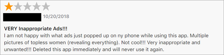 不快な広告の場合、技術的な問題はありませんが、内容と表示される場所に問題があります。「不快」に感じるかどうかはユーザー次第です。ユーザーは、その人の個人的な要因によってあるコンテンツを不快に感じ、それを避けるためにすぐにアプリをアンインストールするでしょう。子ども向けのアプリであれば、たとえばアダルトコンテンツを含めるべきではありません。また、あなたが健康・フィットネスのアプリをもっているのであれば、ファストフード店の広告はブラックリストに入れたいと思うかも知れません。