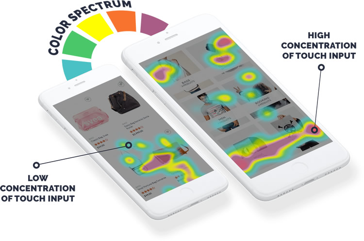 先に述べたように、悪質なモバイル広告は低い解像度やおかしなサイジング、不適切なボタン配置やリンク切れなど、UIデザインによくみられる病を患っています。こうした問題を突き止めるのは簡単ではありません。タッチヒートマップを使えば、アプリのそれぞれの画面の上に、ひと目でわかるインタラクションのマップを重ね合わせることで、全画面表示される悪質な広告に対処することができます。特定のタイプのインタラクション(最初の動作、最後の動作、反応が起きなかった動作など)に絞ってヒートマップを表示すれば、悪質なモバイル広告を簡単に監視することができるでしょう。