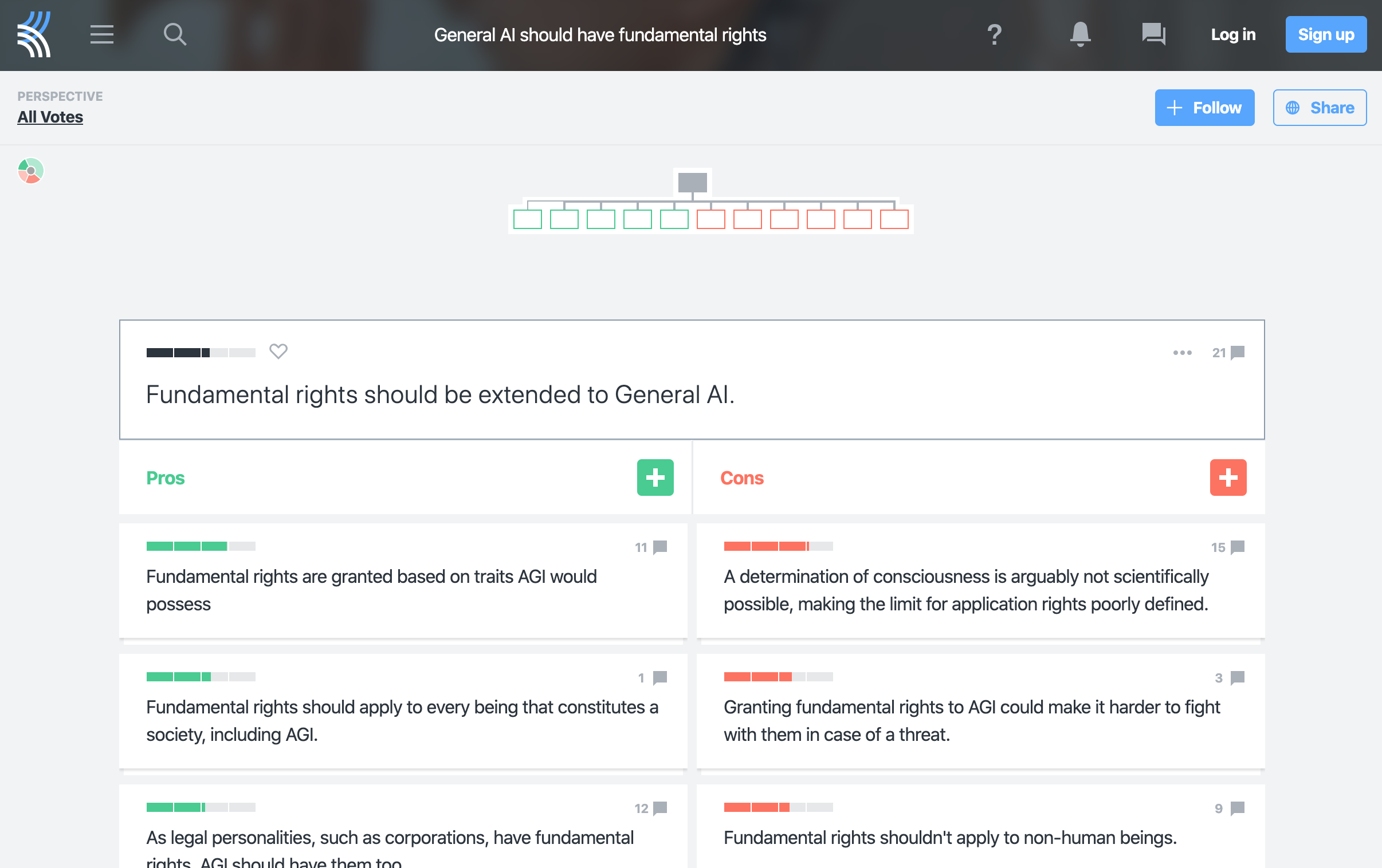 中村:「Kialo」というディベートするためのプラットフォームがあるのですが、UIのつくり方やみせ方が面白いんです。1個のテーマがあったときに、緑が賛成で赤が反対。そしてその1個の意見をみると、さらに細分化して、枝分かれしてみることができます。そうやってたくさん意見が出てきます。