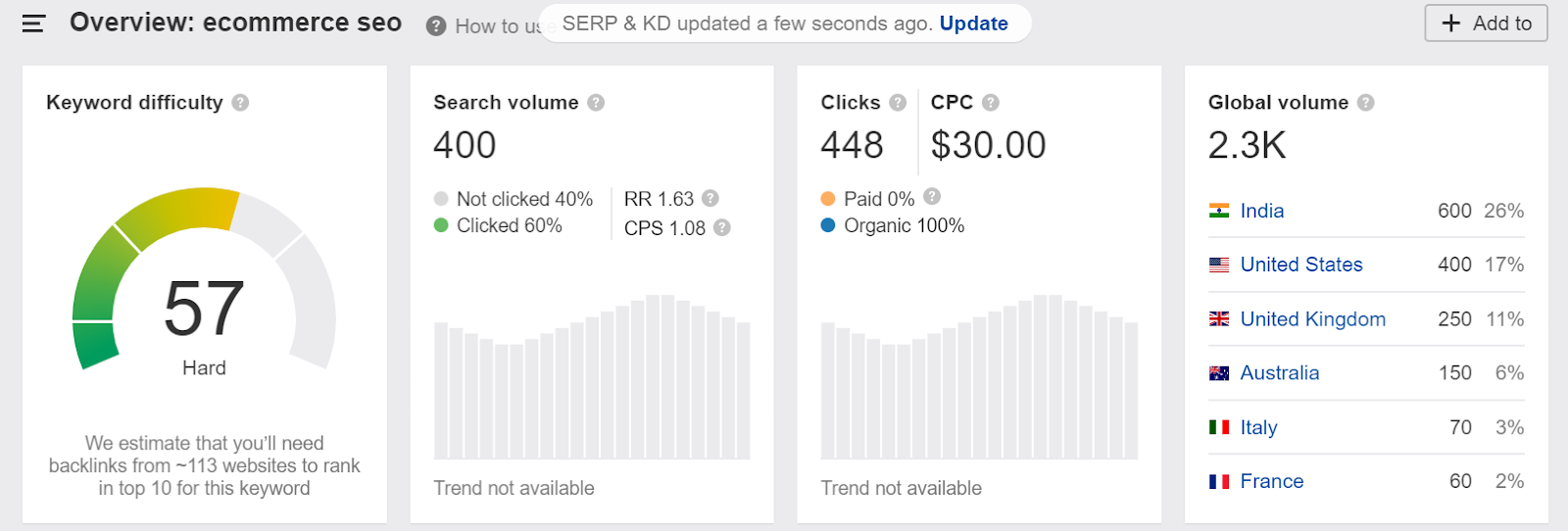 SEOにとってキーワードのリサーチと検索データが重要であることは誰もが知っています。しかし、すべての違いを生むのは、そのデータの使い方なのです。例として、下の「ecommerce SEO」というキーワードについてのデータをみてみましょう。