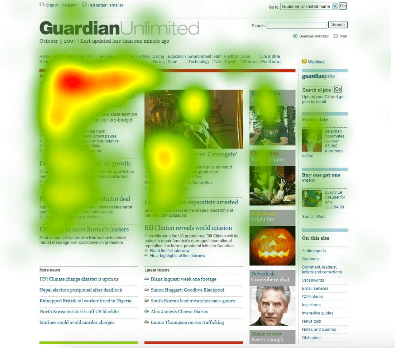 - ヒートマップ:ユーザーがどのようにカーソルを動かしているかを追跡できます。なにがユーザーを惹きつけ、どこで止まり、どこで戸惑っているかがみて取れます。最近では、モバイルアプリ用のタッチヒートマップなるものもあります。ヒートマップの例としては、CrazyEgg、HotJar、Heatmapといったものが挙げられるでしょう。以下が、ヒートマップの画面の例です。