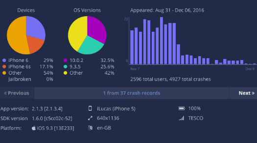 - バグ/クラッシュレポート:ユーザーはサイトがクラッシュした場合に離脱することが多いため、どの処理でクラッシュが起こったかを知っておくべきでしょう。BugSee、Appsee、Buddybuildといったサービスはこの機能を含んでいます。