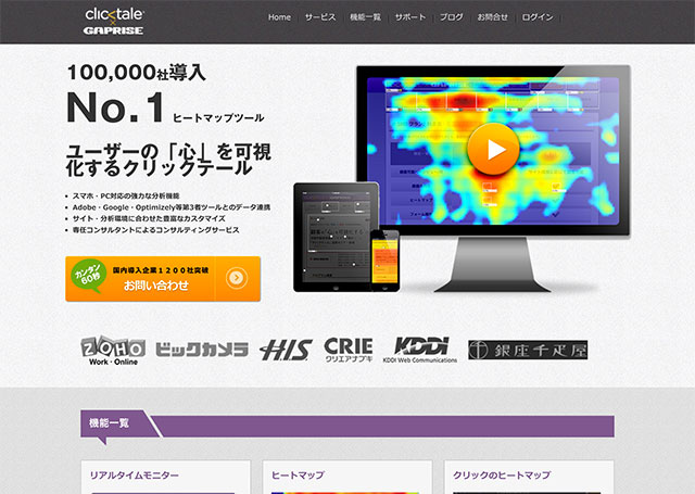 ヒートマップツールとしてはとても有名な分析ツールです。国内外で利用されており、日本では1,200社を超える企業が採用しています。ヒートマップの基本的な機能以外にも、マウスの動きを録画したり、アクセス解析ツールのGoogle Analyticsと連携できたりもします。