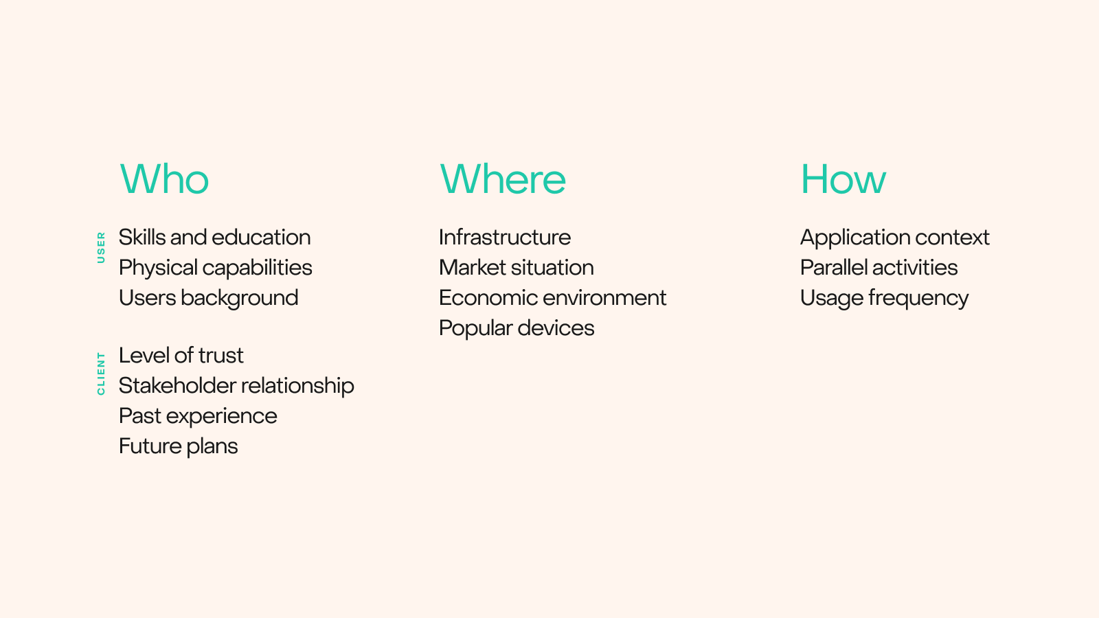 タスクが複雑で、不確定なときにはコンテキストが特に重要です。インタラクティブなプロダクトをデザインするときには考慮すべき重要な側面が数多くあります。デザインを行う人の能力やバックグラウンド、経験、好み、彼らが望む活動、それから彼らがデザインを行う環境や人の設定などです。タスクの要請に合うデザインをつくることはできても、コンテキストが考慮されていなければ受け入れられることはできないでしょう。