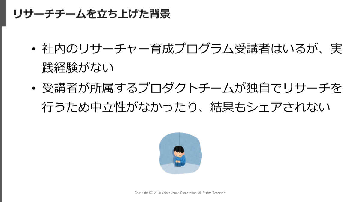 そこで、もっとUXリサーチを育てて会社のいろいろな場所で活躍してほしいという思いを込めて、育成プログラムというのも行ってきました。私も2013年頃に受講しています。今も毎期行われているのですでに数百人ほどの受講者がいて、もちろんYahoo!ニュースには私以外の受講者もいます。しかし、そうしたプログラムを受けたはいいものの、実際にその業務を行ったことがないという人がほとんどだったのです。