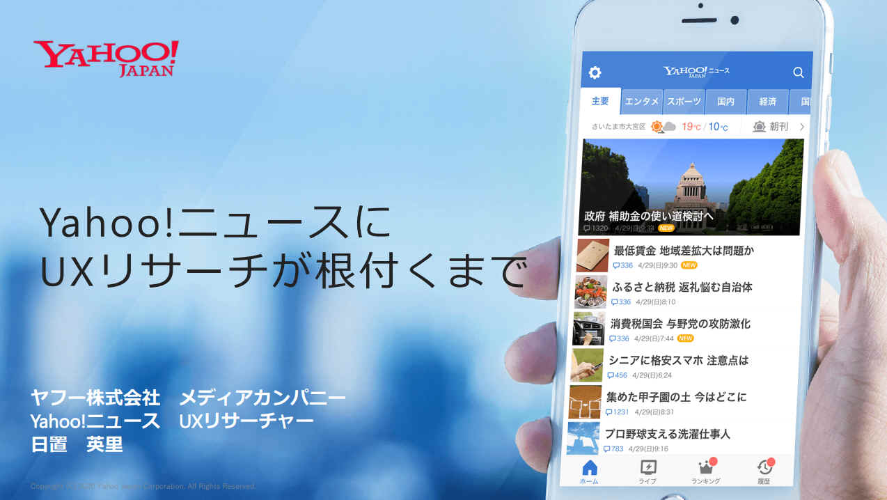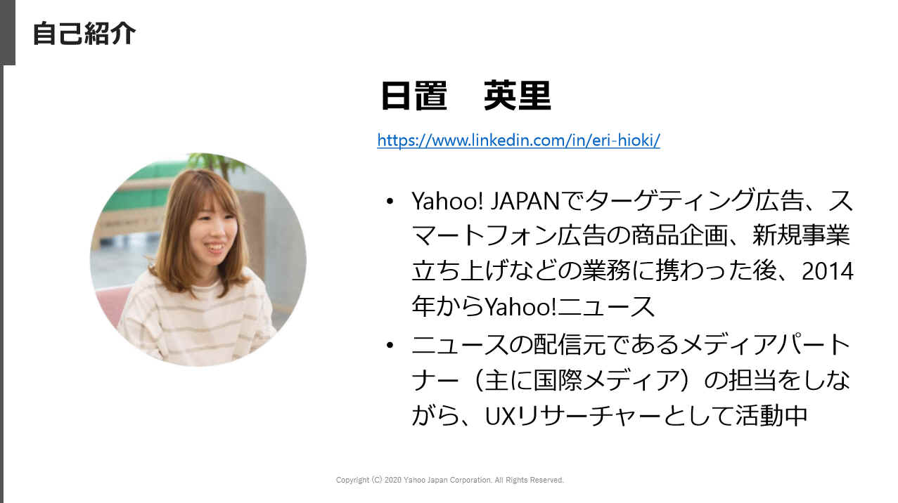 Yahoo!ニュースの日置と申します。本日はYahoo!ニュースでUXリサーチをどのように行い、そしてプロダクト改善に活かしているのかということについてお話ししたいと思います。
