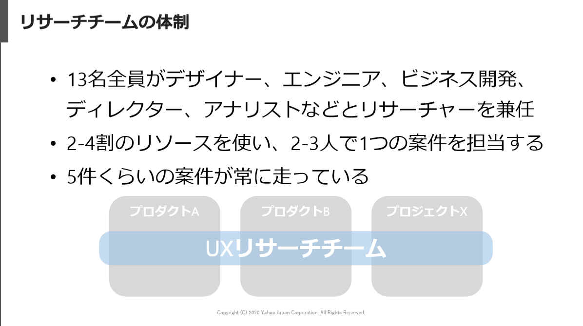 そういうわけで、そうした業務を行いつつUXリサーチャーとしても活動するという、兼任のチームを作りました。現在も私を含む全員が何かと兼務でやっています。もともとYahoo!ニュースでは、一人がひとつのプロダクトチームに所属してその仕事だけをするということはあまりありません。