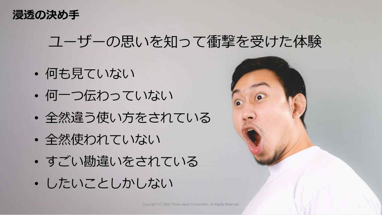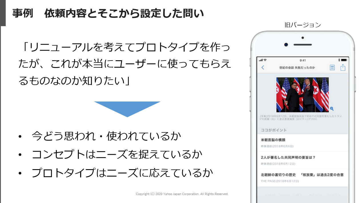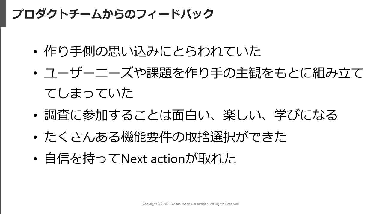 やはりはじめは予算を当ててもらえないので、社内のユーザを対象にした調査を何回もします。そうすると、Yahoo!ニュースのことに詳しい、バイアスがかかった人からしか話を聞けないということがわかったので、一般のユーザにも聞いてみたいと説得して予算を分けてもらった形ですね。