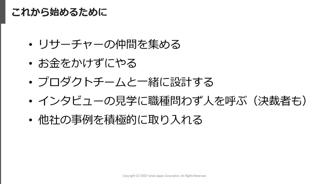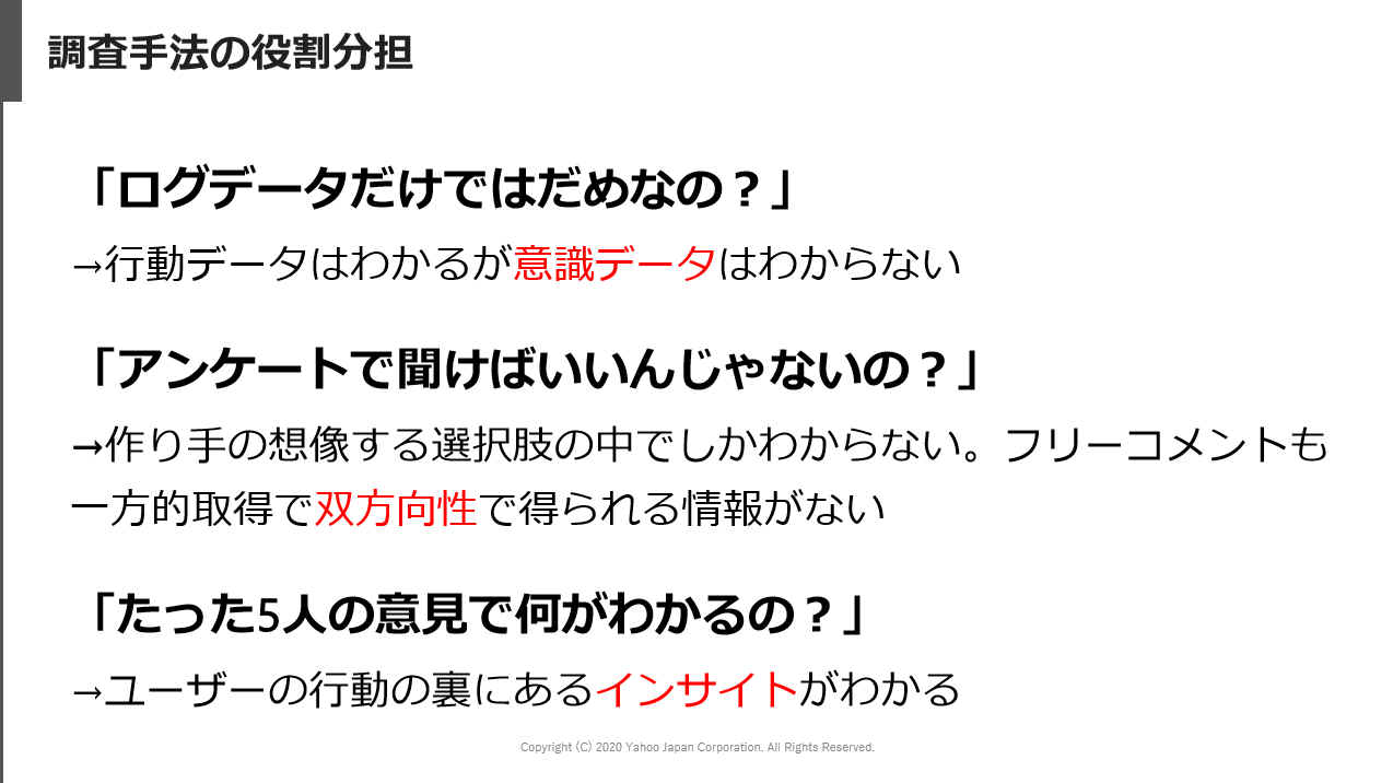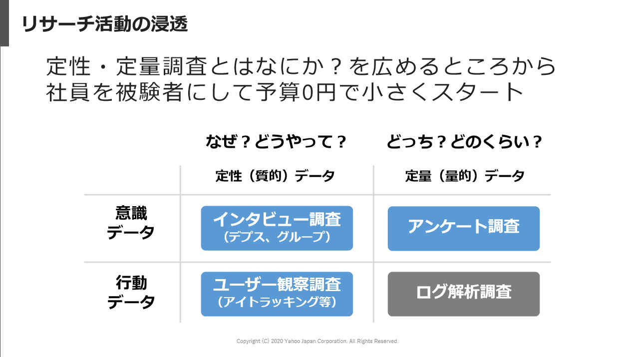 そしてもう一つが、やはり最初はお金をかけられないということで、社員を一般のユーザの被験者として募集して、お金をかけずに小さく調査を始めました。ありがたいことに弊社は社員だけでも数千人程いて、彼らも一歩仕事を離れるとYahoo!のサービスをユーザとして使ってくれています。これに関しては今でも行っているのですが、どちらかというと社外の一般ユーザに聞くものよりも、社員を被験者にするお金をかけない調査の方が割合としては多いと思いですね。