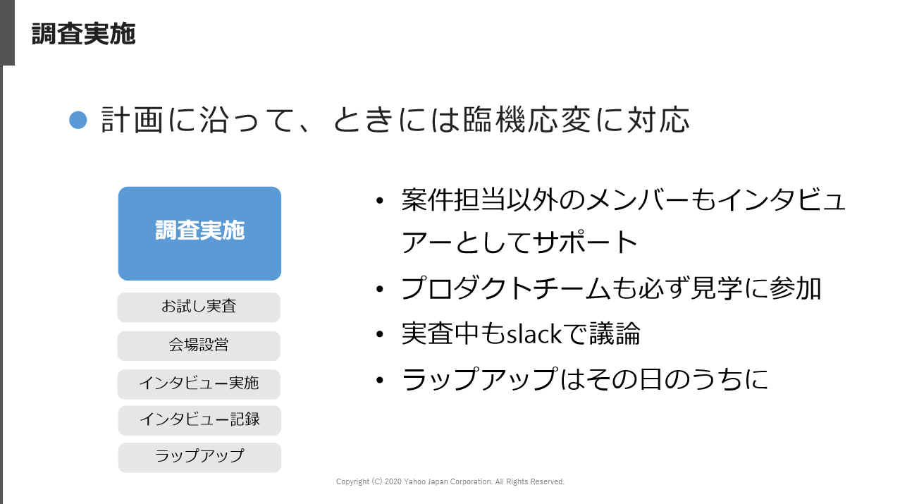 そして計画を立てられたら、いよいよ調査の実施に入ります。先ほど2~3人のグループを作って私がアサインするとお話ししたのですが、いざ調査をやるときはインタビュアーや議事録をとる人も必要です。そこで、案件担当以外のUXリサーチチームのメンバーも、手が空いている人はサポートをしています。実際にインタビュアーをしたり、分析に参加して意見を言ってもらったりという形ですね。