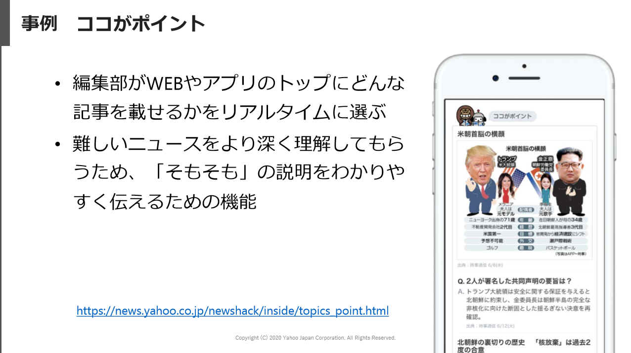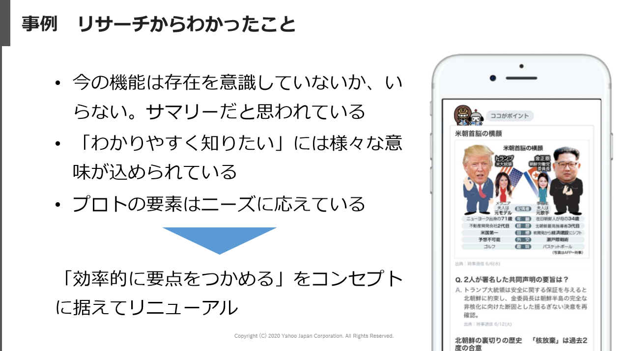 ここまで私たちのリサーチのやり方をお話してきましたが、ここで実際にリサーチを行ってプロダクト改善に活かした事例を一つご紹介します。Yahoo!ニュースの仕組みとして、トップページにどのような記事を載せるかは、専任の編集部において人手で選んでいます。25人程度の編集部のチームなのですが、あらゆるメディアパートナーさんから送られてくる記事全てに目を通して、どれを取り上げるか決めています。そしてその記事が難しい内容であったり理解しにくい場合に、ニュースを正しく理解してもらうための付属情報をつける「ココがポイント」という機能を持っています。