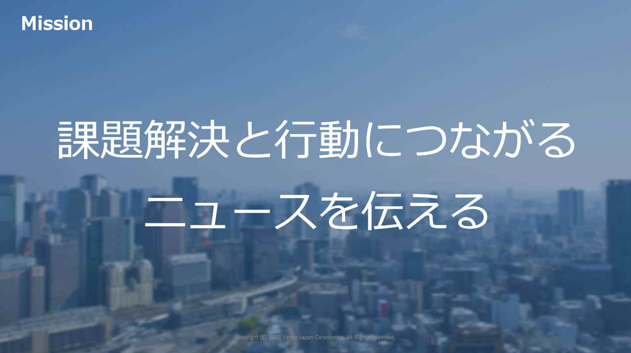 ここまでの話は数字や規模の大きさといったものでしたが、Yahoo!ニュースのミッションとしては、「課題解決と行動につながるニュースを伝える」ということを掲げています。ここで言う行動とは、オンライン上に現れるアクションだけではなく、ユーザの実生活において何か意識の変化が起こることで行った行動も含んでいます。