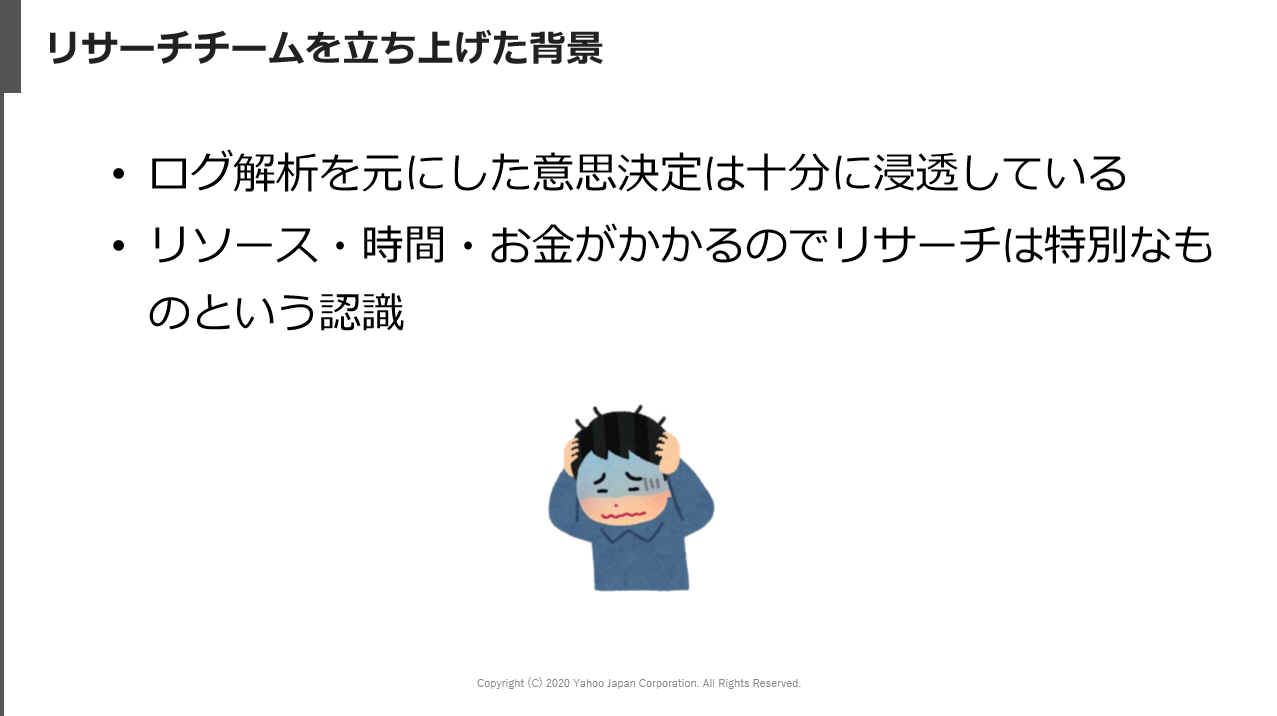 ここからはいよいよUXリサーチチームの話に入っていこうと思います。リサーチチームが誕生する前から、ログ解析を元にして何かの意思決定を行うということは当たり前の文化として存在していました。最初にお話したように、ヤフー株式会社全体でマーケットリサーチを担当したり、UXリサーチを推進したりする部署は10年程前からあったわけです。実際に何か定性的な調査をしたいときは、その部署に協力を仰いで一緒に行うこともありました。