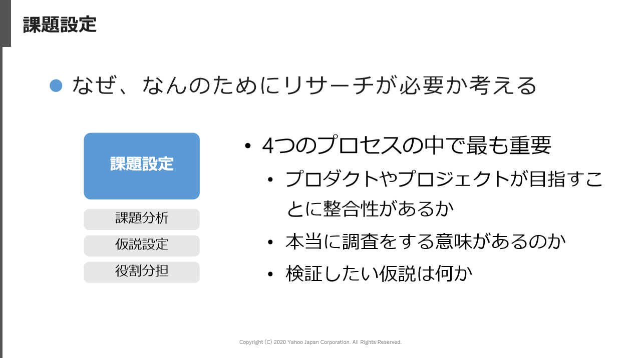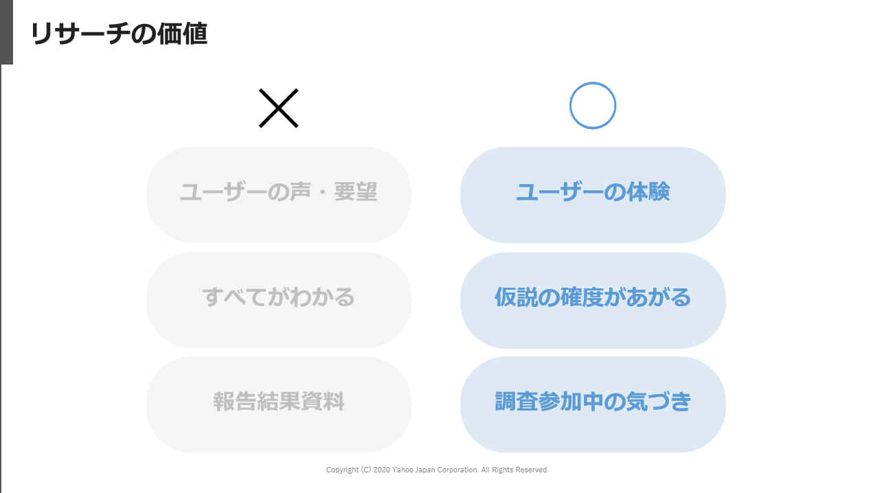 したがってそうしたところも含めて「本当にこのリサーチをやる意味があるのか」というところまで踏み込んでいるのです。仮に言われたとおりに調査をした後に「この施策はYahoo!ニュース全体のためにならない」とわかってしまうと、リサーチ自体が無駄だとは言わないまでも、優先順位が高い他のリサーチに時間を割けたことになります。