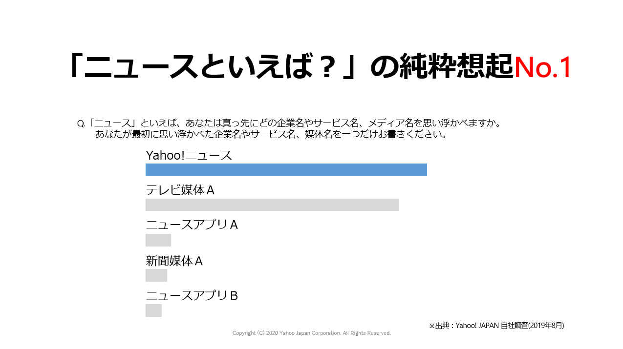 またYahoo! Japanが年に2回一般ユーザを対象にして行っている定点調査で「ニュースといえば何を思い浮かべますか?」という質問をしています。この純粋想起でもYahoo!ニュースは一位という結果が出ています。これは自社調査なので公平性という意味では欠けるとは思いますが、こうしたアンケート調査も私たちのリサーチチームで行っているということもあってご紹介してみました。