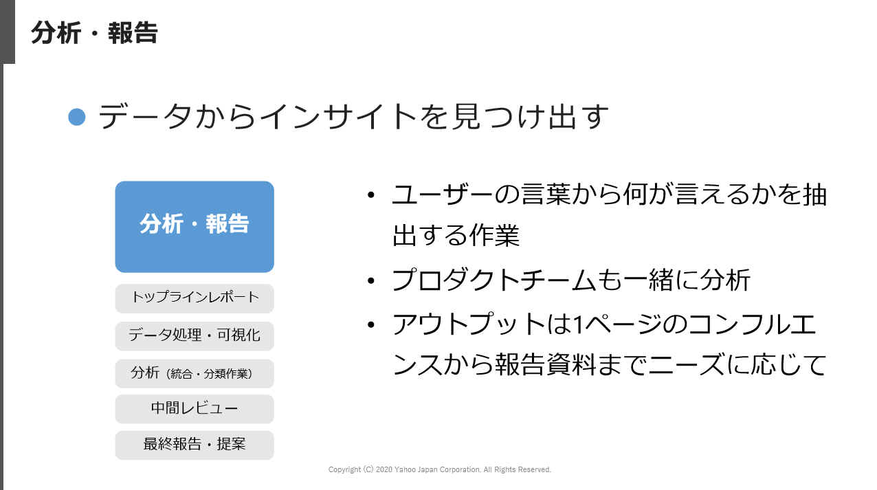 先ほどもお話したとおり職種が分かれていないので、デザイナーのように企画職に含まれてしまうのかなと思いますね。しかし今の13人の組織でも常時5件ほどの調査を回すと手一杯になってしまうので、もう少し人を増やしたいなとは思っています。Yahoo!ニュースの組織に所属している社員の中で、リサーチに興味がある人は探すようにしていますね。