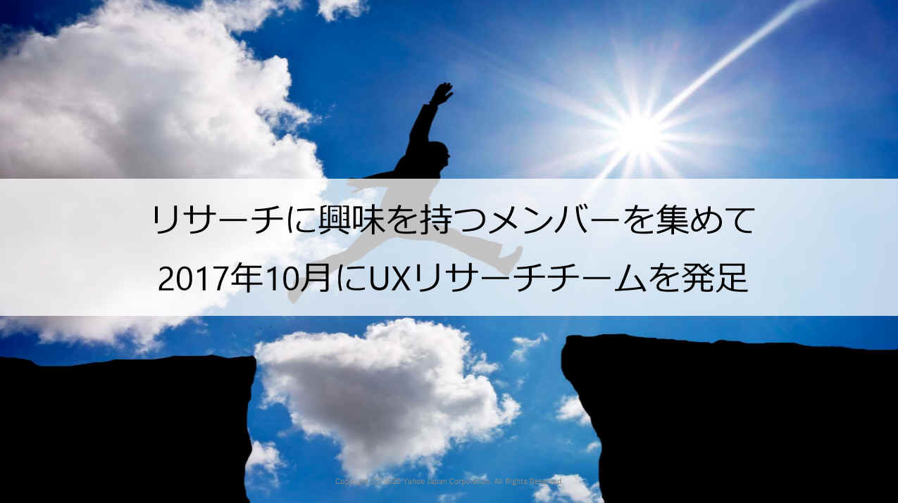 このような背景があった中で、いよいよ2017年の10月にUXリサーチチームを立ち上げることになりました。これはYahoo!ニュースの最終決裁者である、サービスマネージャー自身がこの教育プログラムを受けたということがきっかけになっています。決裁者向けのショートバージョンの育成プログラムだったのですが、それを受けたことで「UXリサーチってすごい」と思ってくれたようで、2年ほど前に実行者を集めてチームを作りました。