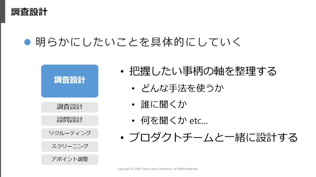 そして課題設定ができた後に、初めて調査設計に入っていくという流れです。リサーチの目指す方向性は最初の課題設定で定めているので、ここからはそこまで難しくありません。