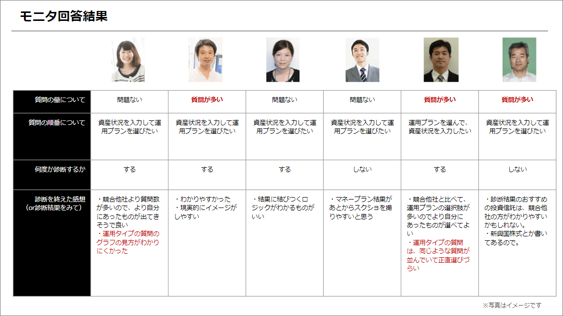 診断する中で現状に関する入力ページは総じてポジティブな意見が多かったですが、これからどんな運用をしていきたいかを聞くページは、金融商品運用の経験がある方とない方で違いが出ましたね。経験のある方はスムーズでしたが、経験のない方はイメージしづらいのか戸惑いが見られました。