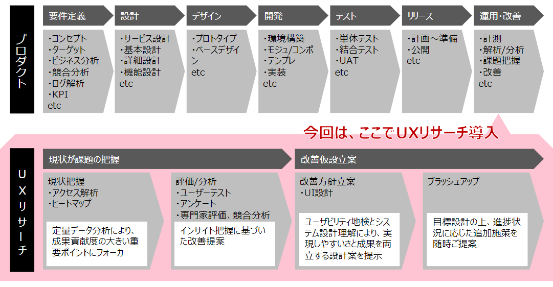今回ご紹介する調査事例「金融商品診断ツールの運用改善/インタビュー調査」は、全体プロセスの中の「運用(リリース後)」のフェーズでUXリサーチを導入した事例です。