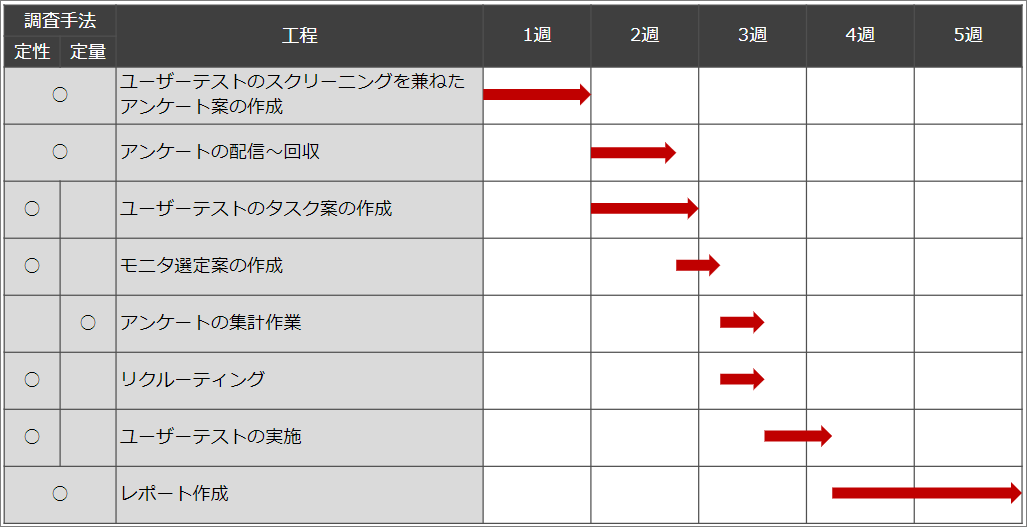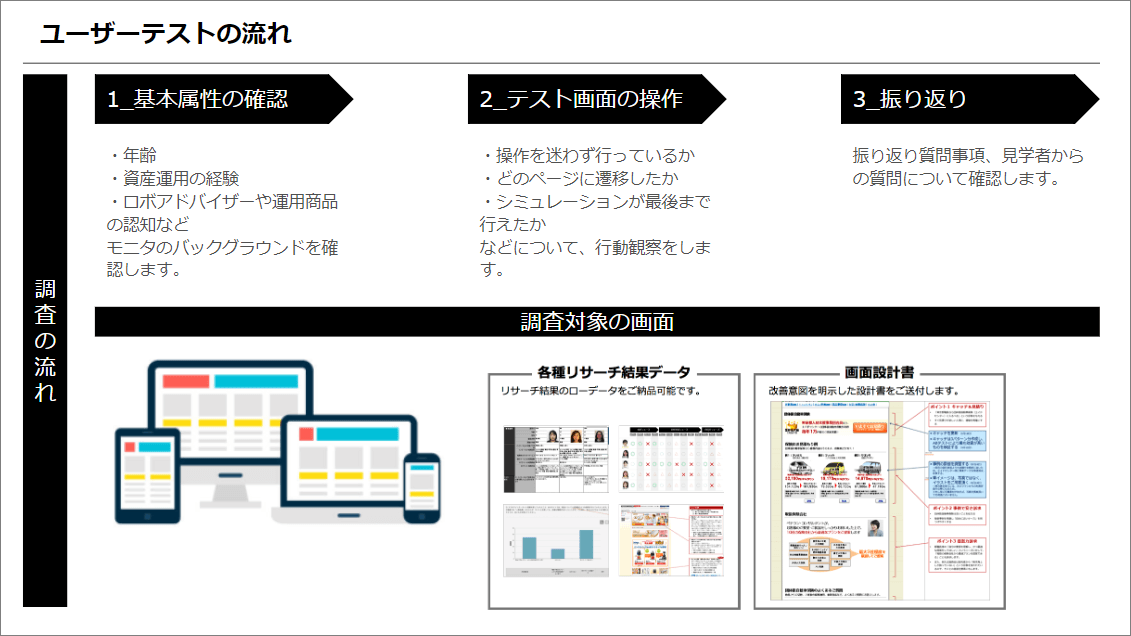 アンケートの方は対象者に配信して、回収状況を見つつ、集計作業をしていく…ということである程度イメージつくのですが、ユーザーテスト(インタビュー調査)の方はどんな感じでしょうか?