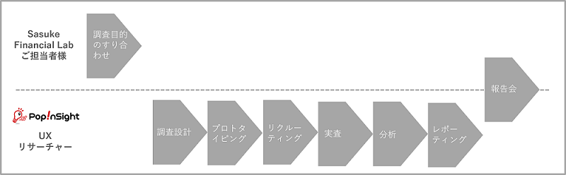 Sasuke Financial Lab様とは、サイトの定性検証・評価が必要になるタイミングでUXリサーチをご依頼いただき、ご支援させていただいております。案件開始のキックオフ時に、検証・評価したいポイントを確認させていただき、どのようなユーザビリティテストの設計がよいかご提案しております。