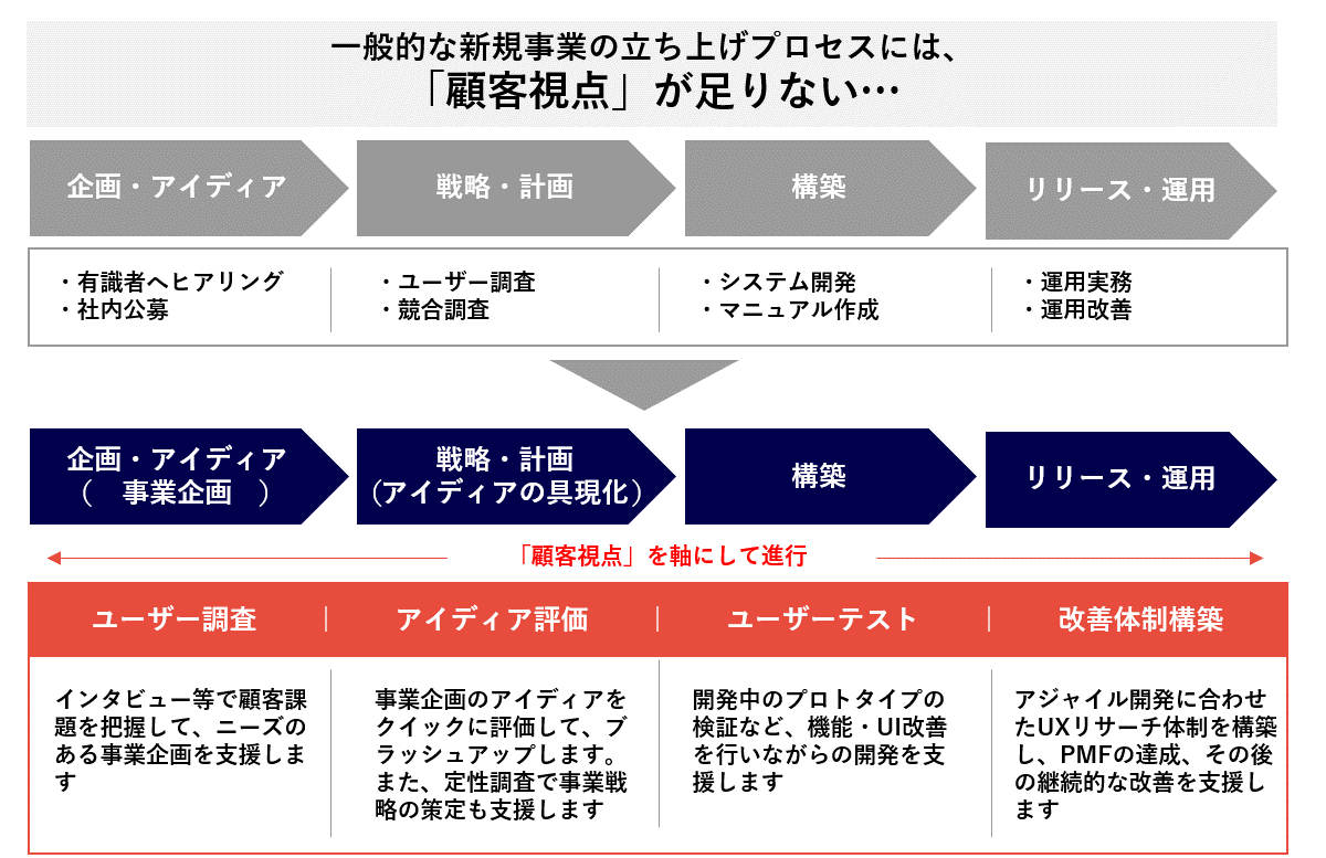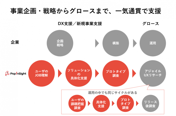 ポップインサイトは、企画やアイディアの創出から構築・運用に至るまで、顧客視点を取り入れて推進し、顧客ニーズに基づいた確度の高い新規事業の立ち上げを支援します。