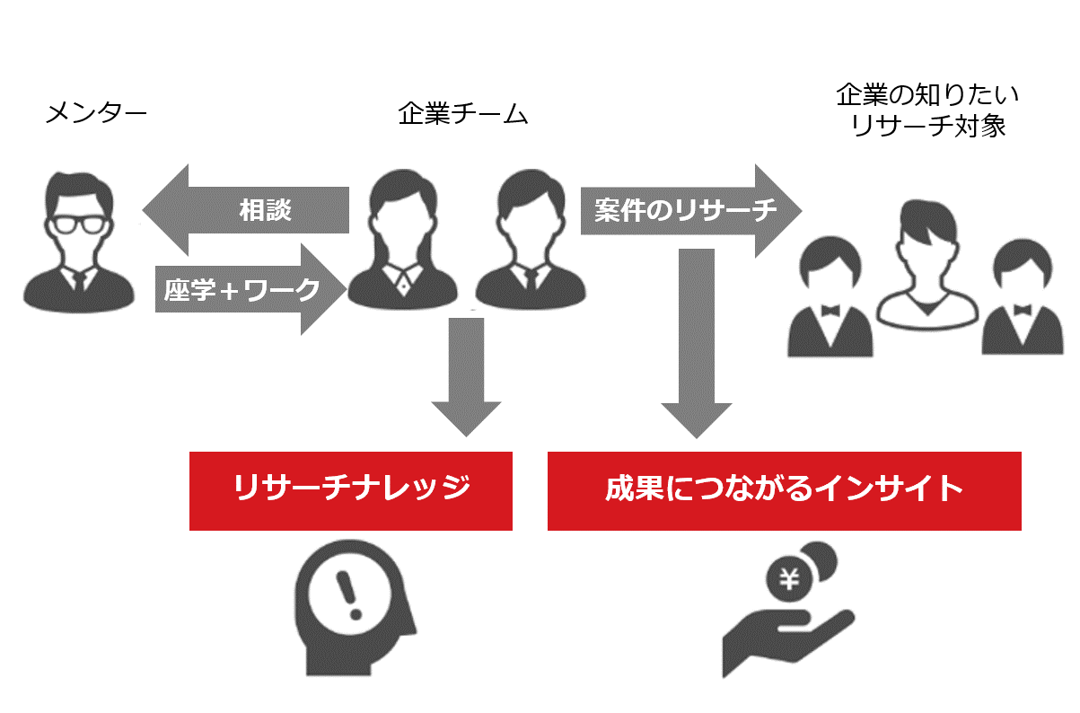 - 企業の事業に直結するリサーチを、企業社員が実施する上で、体系的にメンターがUXリサーチに必要な座学・ワークを通じてそれをサポート