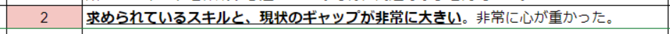 実際にあったケースを例に出すと、「求められているスキルと、現状のギャップが非常に大きい。非常に心が重かった。」という回答。これは、とてもまずいテンション…。こうした大変なケースは、毎週のようにあります。書いてくれているということは、「オープンにしている=コミュニケーションしてほしい!」ということなので、必要な対応をしていきます。