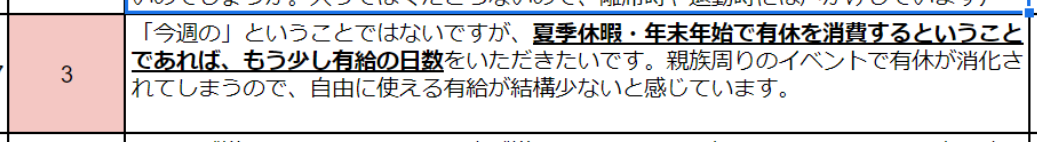 例えば、弊社はもともと夏季休暇や年末年始などの特別休暇がなく、有給を使うのを推奨する、というスタンス。でも、最近入ってきたメンバーの回答に、「有給を消化するということであれば、もう少し日数がほしい。親族のイベントで消化されてしまうので、自由に使える有給が少ないと感じている」という意見がありました。