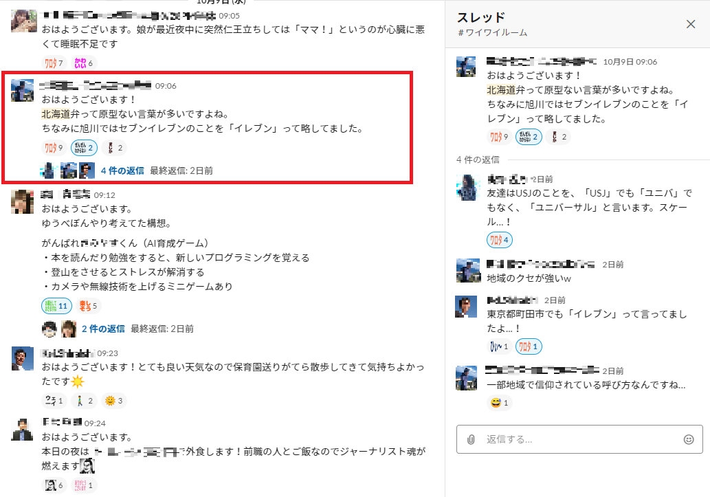 朝ワイワイするときにも、スレッドで盛り上がることが度々あります。